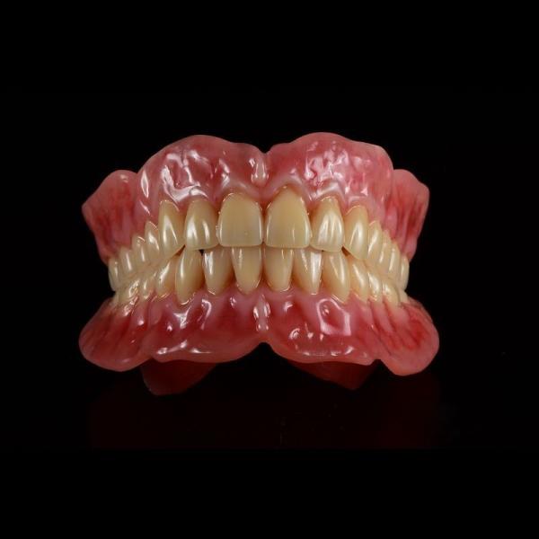 These full denture prosthesis are made with great care and provide a unique custom tooth arrangement based on desired tooth shade, tooth mould and natural tissue contours for a comfortable and functional fit.